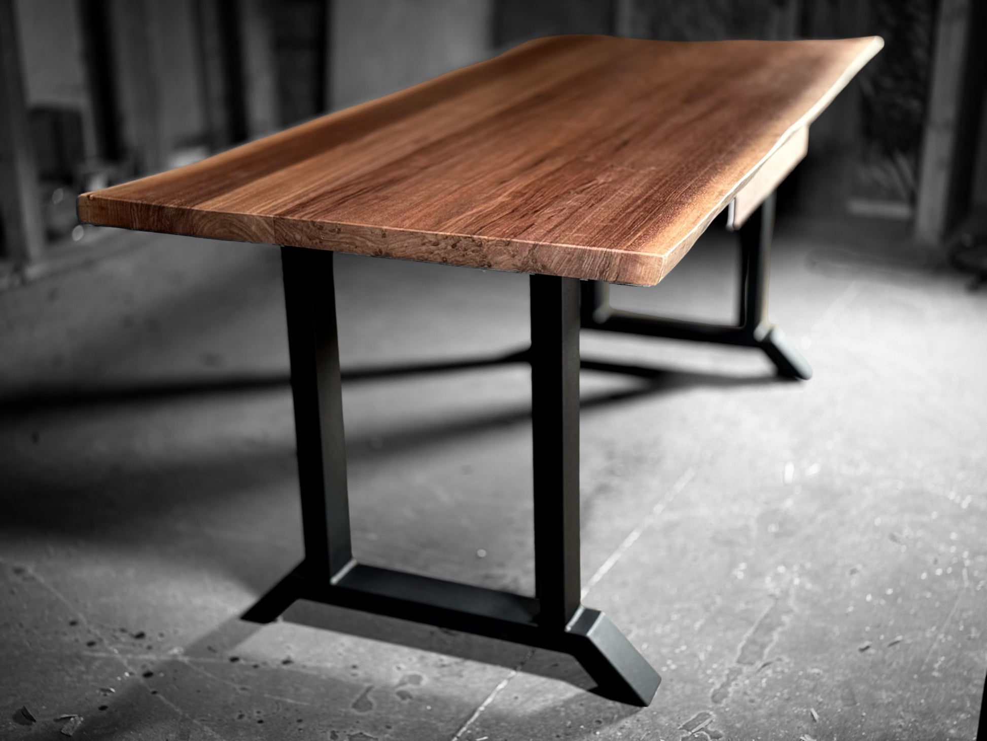 A live edge desktop with sleek black metal legs is a simple combination of natures beauty and modern design. Simple but to the point and not distracting. Choose from dozens of various options in our showroom and make your dream piece today!